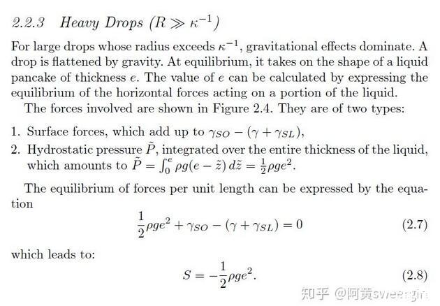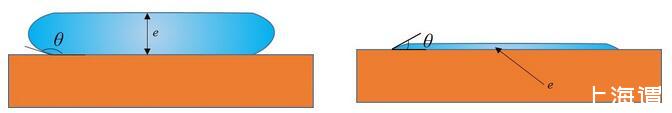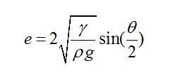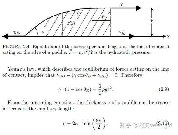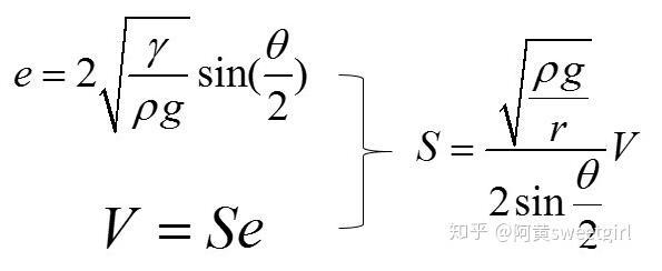 有意思的是,已經(jīng)有前人對(duì)這種情形做過(guò)詳細(xì)的受力分析。得出只要接觸角一定,此時(shí)無(wú)論加多少水,液體的厚度e都不會(huì)增加,只會(huì)增加鋪展的面積。其厚度e的表達(dá)式為:
