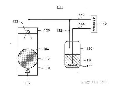 參照?qǐng)D3,在所述引擎蓋的底面上形成了用于破斷移至所述殼體上部的晶片的系合槽。所述系合槽用于使已完成干燥工藝的晶片與所述殼體分離;該小定位置形成了一個(gè)噴射孔,該噴射孔將從上述散裂器噴射的異丙基醇蒸氣引導(dǎo)到上述殼體內(nèi)。