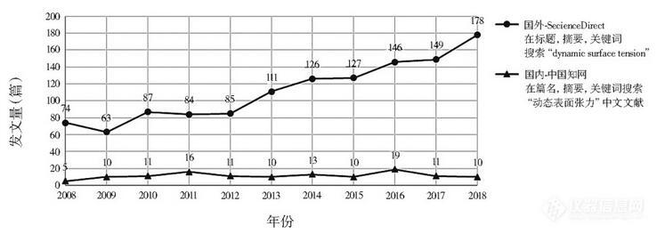 當(dāng)研究的液體吸附過程在快速、持續(xù)進(jìn)行,且短時(shí)間內(nèi)無法達(dá)到平衡時(shí),對液體DST的研究比靜態(tài)表面張力更有意義。如在農(nóng)藥噴灑、噴墨印刷、織物快速潤濕,以及攝影用薄膠片制備中。圖1對比了近10年(2008~2018年)國內(nèi)外發(fā)表的以DST為主要考察項(xiàng)的論文數(shù)。數(shù)據(jù)顯示國內(nèi)在DST方面的研究較少且總體波動不大,而國外則呈持續(xù)上升趨勢。