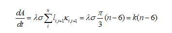 下面我們推導(dǎo)二維泡沫的演變方程,由于任一氣泡跟周圍氣泡的氣體交換都是通過氣泡邊界進(jìn)行的,則氣泡體積(二維氣泡用面積表示)隨時間的變化率跟邊界長度和邊界上的壓強(qiáng)差都有關(guān)系,可以表示為