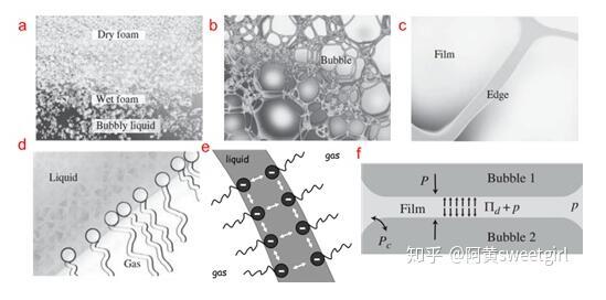圖1.不同尺度下的泡沫結(jié)構(gòu)及穩(wěn)定機(jī)制(Ref 1)(a)整個泡沫結(jié)構(gòu),尺度為0.01 m至1 m。(b)干泡沫的放大部分,尺度為0.1 mm至1 cm。(c)液體通道,也叫Plateau邊界,尺度為1 um至0.1 mm以及肥皂泡膜,尺度為10 nm到1 um。(d)氣液界面的分子層結(jié)構(gòu),尺度為0.1 nm到10 nm。e-f)氣泡膜在界面靜電力排斥作用即楔裂壓(disjoining pressure)的作用下而穩(wěn)定存在。