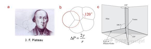 泡沫物理學(xué)集中于研究泡沫的結(jié)構(gòu)、靜力學(xué)、動態(tài)演變及排液等內(nèi)容。它是一個十分古老的學(xué)科,由比利時物理學(xué)家Plateau在19世紀(jì)中葉開創(chuàng)(圖2a)。Plateau在數(shù)十年的失明的時光里,依舊通過指導(dǎo)他侄子做試驗,堅持研究肥皂泡薄膜的幾何形態(tài)及其背后隱藏的力學(xué)規(guī)律。1873年,他和侄子把自己的實驗現(xiàn)象和分析結(jié)果做了系統(tǒng)整理,以法文發(fā)表,從此把對泡沫結(jié)構(gòu)的研究由定性印象推到了量化階段,開創(chuàng)了泡沫物理學(xué)(Ref 2)。在泡沫靜力學(xué)方面,Plateau的主要貢獻(xiàn)在于其提出了干泡沫的靜態(tài)結(jié)構(gòu)力學(xué)的三定律,它是后續(xù)泡沫研究的基石: