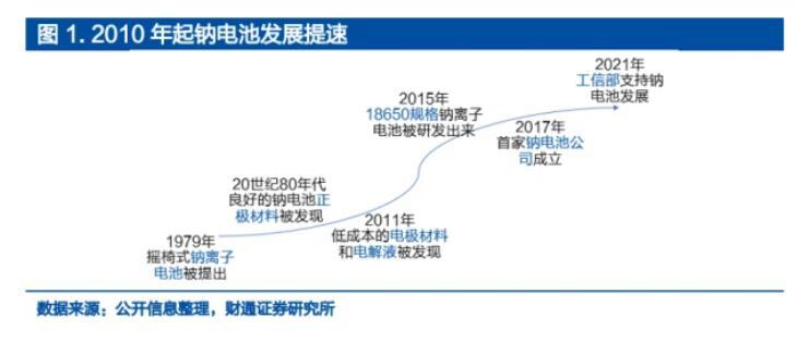 鈉電池隨著產(chǎn)業(yè)化加速,量產(chǎn)在即。1979年法國的Armand提出了“搖椅式電池”的概念,開始鈉離子電池的研究。隨后Delmas和Goodenough發(fā)現(xiàn)了層狀氧化物材料可作為鈉電池正極材料,Stevens和Dahn發(fā)現(xiàn)硬碳材料作為負極有良好的鈉離子嵌脫性能。2010年以來,鈉電池的研發(fā)進程加速。2011年中科院物理所研究員團隊開始了鈉離子電池核心技術(shù)的研發(fā),自此以后開發(fā)出低成本的電極材料。2017年國內(nèi)第一家專注于鈉離子電池研發(fā)和生產(chǎn)的公司中科海鈉成立。2021年寧德時代成功舉行了第一代鈉離子電池線上發(fā)布會。2022年,中科海納和傳藝科技均預(yù)計2023年量產(chǎn)其鈉離子電池。