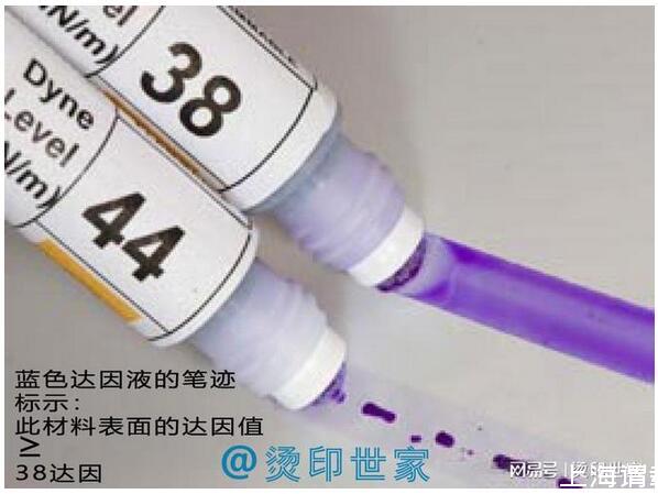 達(dá)因筆是一種簡便的測量表面張力的方法,常用于快速檢查PE和PP以及大多數(shù)非吸收性基材的表面張力。達(dá)因筆有36、38、40、42、44等各種規(guī)格,其表達(dá)的就是相應(yīng)的表面張力系數(shù)。