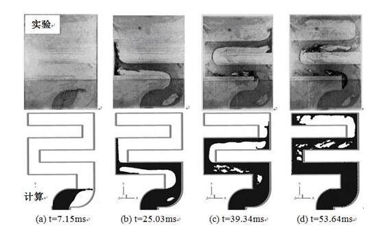 S形型腔充型過程的SPH數(shù)值模擬結果和實驗結果[9]對比