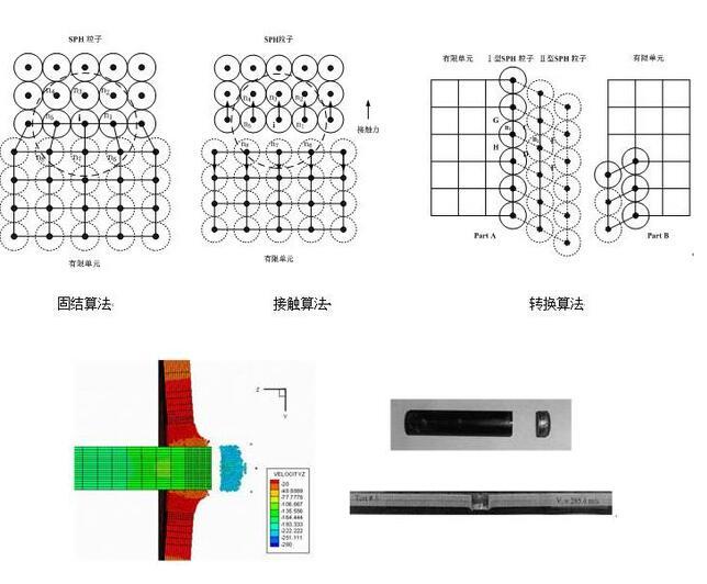 為解決計算力學中的大變形問題,建立一系列SPH-FEM耦合算法:①固結;②接觸;③轉換。其中,SPH-FEM固結算法適用于同一物體內(nèi)部,如沖擊問題中將靶板的彈著點區(qū)域離散為SPH粒子,其余部分離散為有限單元;SPH-FEM接觸算法適用于不同物體之間,如流固耦合問題中將流體離散為SPH粒子,固體離散為有限單元;SPH-FEM轉換算法適用于大變形位置和范圍未知的情況,如裂紋擴展問題,問題域初始離散為有限單元,計算中裂紋擴展方向上的有限單元轉換為SPH粒子。
