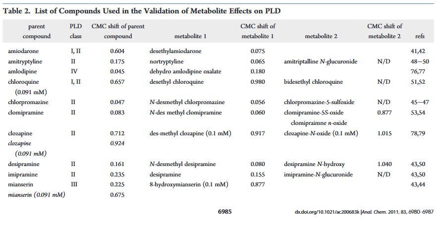 已經(jīng)有許多出版物描述了PLD藥物代謝產(chǎn)物所致。其中,初級代謝輕的胺碘酮,去乙基胺碘酮,已經(jīng)討論過14,38-40優(yōu)先積累代謝物已觀察到胺碘酮過量,尤其是短期39這為我們的檢測數(shù)據(jù)提供了可能的解釋其中去乙基胺碘酮是胺碘酮的主要代謝物,41,42表現(xiàn)出更高的PLD誘導(dǎo)潛力。相似地,8-羥基米安色林之間的CMC位移差異,米安色林、43,44和米安色林的主要氧化代謝物比其他兩個之間的差異更顯著成對的親本和代謝物。由于溶解度的限制,父母和代謝組的劑量濃度不同氯氮平和米安色林。這可能是導(dǎo)致觀察到的CMC偏移的顯著差異母體和代謝物之間。在較低濃度下測試時相比之下,氯氮平從低電位誘導(dǎo)劑轉(zhuǎn)變?yōu)榉钦T導(dǎo)劑,而米安色林仍然作為誘導(dǎo)劑但具有更高的CMCDL/CMCL值。值得注意的是,目前測試集中的大多數(shù)CAD被報告為氧化代謝其相應(yīng)的脫烷基初級代謝物。為了了解相應(yīng)初級的PLD電位代謝物,我們測試了額外的代謝物。之間測試的代謝物是初級去甲基代謝物氯丙嗪、45?47阿米替林、48?50丙咪嗪、43,50和pri-氯喹的瑪麗和次級脫乙基代謝物。51,52此外,由雜原子氧化形成的氧化代謝物地昔帕明43,50和氯胺酮的重釋和脫烷基代謝物pramine53,54進行了評估。與其他CAD一樣,代謝物可以如果它們具有合適的理化性質(zhì),則誘導(dǎo)PLD。32相反,代謝物將失去結(jié)合能力如果CAD特征丟失,則使用脂質(zhì),例如用脂質(zhì)觀察氯米帕明N-氧化物和地昔帕明N-羥基(圖4和表2)。