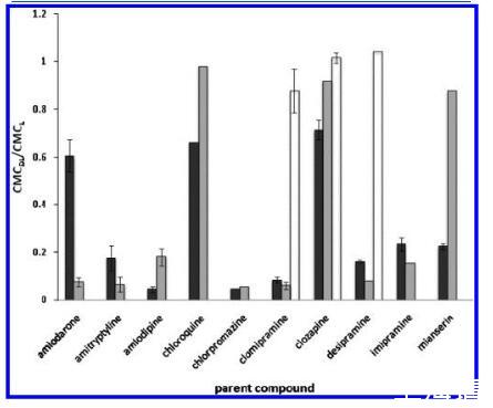 圖5.CMC偏移(由CMC之間的比率表示)藥物-脂質(zhì)復(fù)合物(DL)和單獨脂質(zhì)的CMC(L):CMCDL/CMCL)的測試化合物(黑色)及其主要代謝物(灰色、初級代謝物;白色,次生代謝物)在pH 7.2中分析HEPES緩沖液。使用的藥物濃度為1 mM,除非另有說明見表2。誤差線被分配給那些n g3測試的化合物。對于氯氮平和米安色林,均為0.91和0.091 mM用于測試,但僅來自1 mM測試的數(shù)據(jù)被策劃。