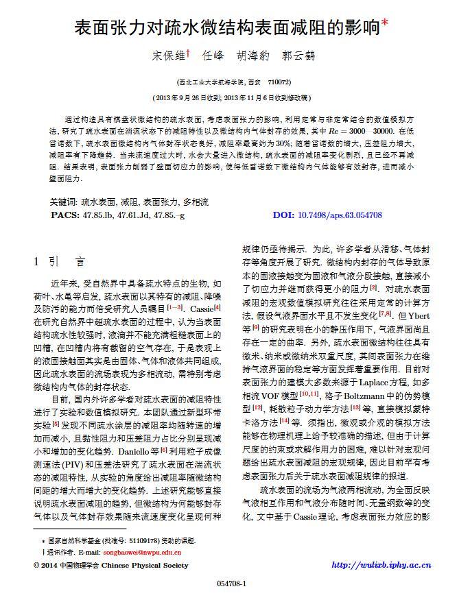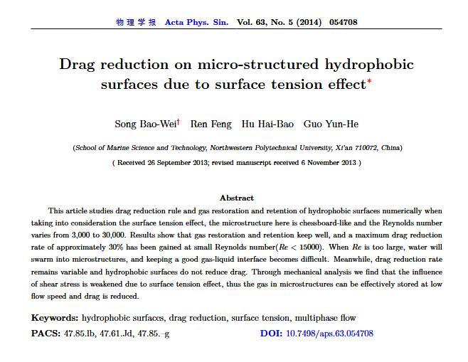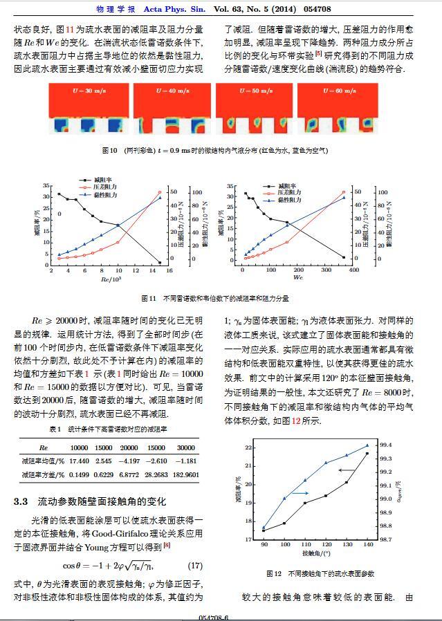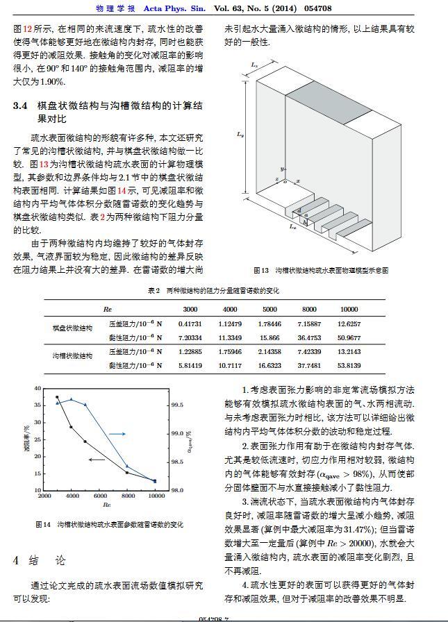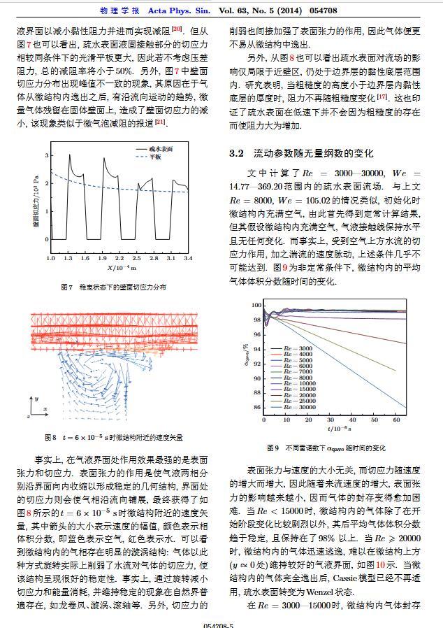 通過(guò)構(gòu)造具有棋盤狀微結(jié)構(gòu)的疏水表面,考慮表面張力的影響,利用定常與非定常結(jié)合的數(shù)值模擬方法,研究了疏水表面在湍流狀態(tài)下的減阻特性以及微結(jié)構(gòu)內(nèi)氣體封存的效果,其中Re=3000—30000.在低雷諾數(shù)下,疏水表面微結(jié)構(gòu)內(nèi)氣體封存狀態(tài)良好,減阻率最高約為30%;隨著雷諾數(shù)的增大,壓差阻力增大,減阻率有下降趨勢(shì).當(dāng)來(lái)流速度過(guò)大時(shí),水會(huì)大量進(jìn)入微結(jié)構(gòu),疏水表面的減阻率變化劇烈,且已經(jīng)不再減阻.結(jié)果表明,表面張力削弱了壁面切應(yīng)力的影響,使得低雷諾數(shù)下微結(jié)構(gòu)內(nèi)氣體能夠有效封存,進(jìn)而減小壁面阻力.