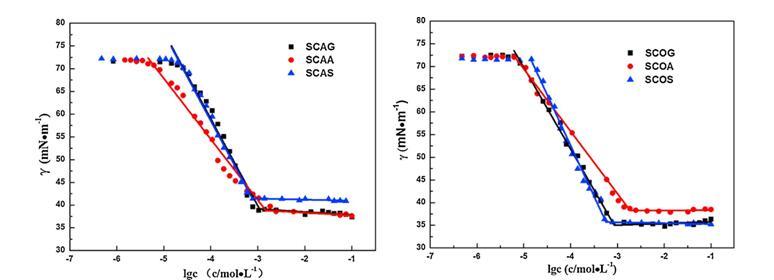 圖1 6種來自蓖麻油(左)和棉籽油(右)的?;被岜砻婊钚詣┰?5°C下的表面張力曲線。畫線以顯示斷點(diǎn)。