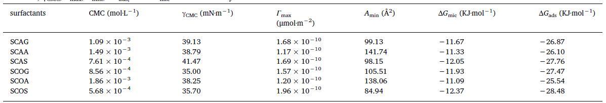 表格1 6種?;被岜砻婊钚詣┰?5℃下的CMC、γCMC、Γmax、Amin、ΔGads和ΔGmic值。