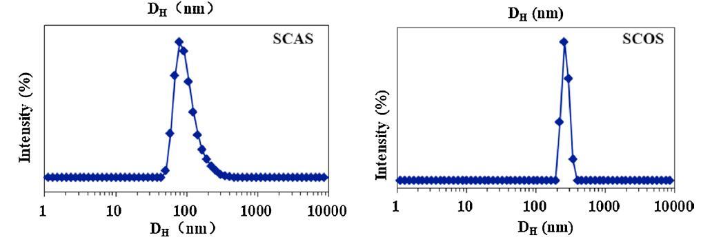 用DLS測(cè)量在6種?;被岜砻婊钚詣┧芤褐行纬傻木奂w的大小和分布,其CMC為5倍,5×CMC。圖2顯示了它們的表觀等效流體動(dòng)力學(xué)直徑(DH)。除絲氨酸外,蓖麻油表面活性劑的DH分布普遍大于棉籽油表面活性劑的DH分布。SCAG和SCAA的DH分布分別集中在900和150 nm,而SCOG和SCOA聚集體的直徑約為10 nm。對(duì)于絲氨酸,SCAS和SCOS的平均DH值分別約為100 nm和250 nm。這些結(jié)果可以通過蓖麻油衍生的表面活性劑的蓖麻油基和絲氨酸頭部基團(tuán)上都存在-OH基團(tuán)來解釋,促進(jìn)了大聚集體,例如囊泡的形成(圖2)。