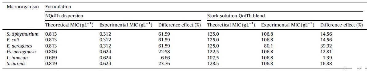 將NQoTh納米顆粒分散體的AM與用于制造NP(QoLMW/Th的混合物)的儲備溶液的AM進(jìn)行比較。對于所有測試的微生物,NQoThs對微生物的活力表現(xiàn)出強大的影響,在NQoThs的原液分散體稀釋90%時實現(xiàn)了生長抑制。對于S.typhimurium、E.coli和E.aerogenes,QoLMW/Th溶液的60%稀釋會抑制微生物的活力。銅綠假單胞菌、無害乳桿菌和金黃色葡萄球菌在80%(v/v)稀釋時被NQoThs抑制,而QoLMW/Th溶液需要60%(v/v)稀釋。