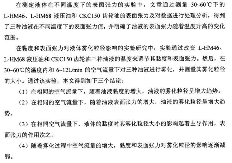 在黏度和表面張力對液體霧化粒徑影響的實(shí)驗(yàn)研究中,實(shí)驗(yàn)通過改變L-HM46、 L-HM68液壓油和CKC150齒輪油三種油液的溫度來調(diào)節(jié)其黏度和表面張力。然后,在30~60℃的溫度內(nèi)和6~12L/min的空氣流量下對三種油液進(jìn)行霧化,并測量其霧化粒徑的大小。通過該實(shí)驗(yàn),本文得到如下三個(gè)結(jié)論: