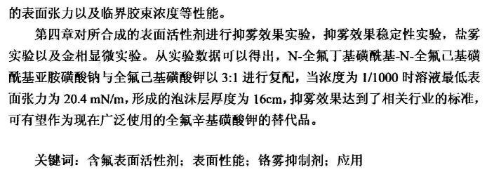 第四章對所合成的表面活性劑進(jìn)行抑霧效果實(shí)驗,抑霧效果穩(wěn)定性實(shí)驗,鹽霧實(shí)驗以及金相顯微實(shí)驗。從實(shí)驗數(shù)據(jù)可以得出,N-全氟丁基磺?;?N-全氟己基磺酰基亞胺磺酸鈉與全氟己基磺酸鉀以3:1進(jìn)行復(fù)配,當(dāng)濃度為1/1000時溶液最低表面張力為20.4mN/m,形成的泡沫層厚度為16cm,抑霧效果達(dá)到了相關(guān)行業(yè)的標(biāo)準(zhǔn),可有望作為現(xiàn)在廣泛使用的全氟辛基磺酸鉀的替代品。