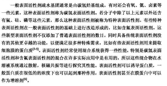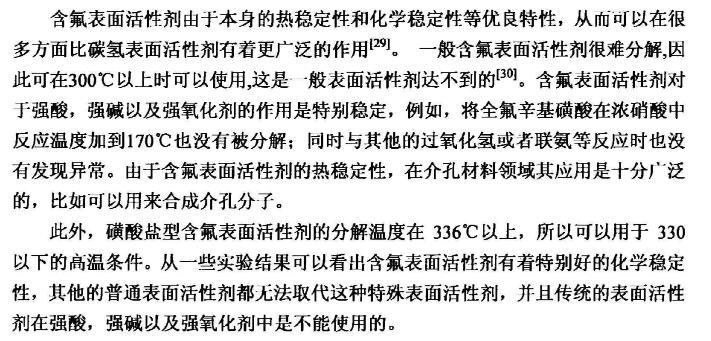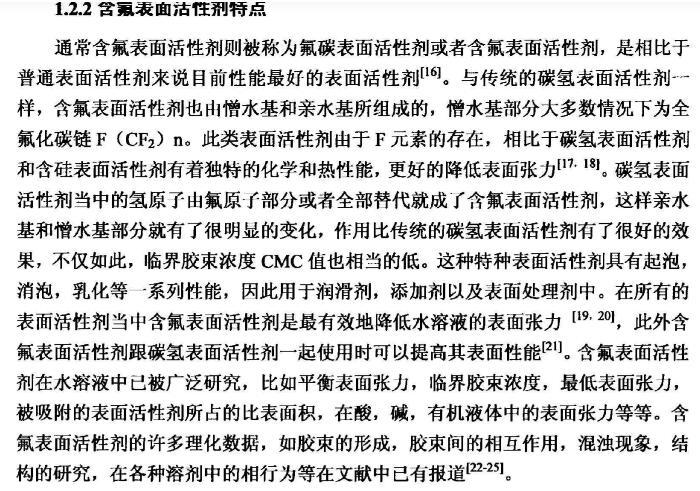 【摘要】:本論文首先對新型含氟表面活性劑的特性,應(yīng)用領(lǐng)域,國內(nèi)外研究進(jìn)展進(jìn)行了全面的綜述。含氟表面活性劑是目前最受青睞的特種表面活性劑,相比于傳統(tǒng)的碳?xì)浔砻婊钚詣?,含氟表面活性劑的用量少,降低水溶液表面張力的作用?qiáng),同時可以跟其它表面活性劑起到很好的復(fù)配效果,可以應(yīng)用于消防、鉻霧抑制劑、造紙、冶金、起泡與消泡劑的合成等很多領(lǐng)域。