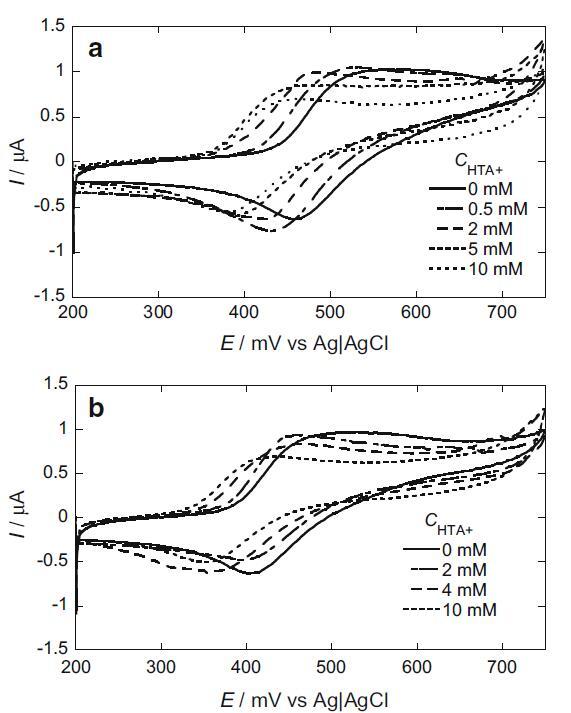 我們還研究了 HTA+ 陽(yáng)離子的影響(圖 6)。 來自界面張力測(cè)量的 HTA+ 離子的 cmc 與圖 6 標(biāo)題中所述的 CV 測(cè)量溶液相同,為 3.95 mM。 I2/I? 的陽(yáng)極和陰極峰均高于不存在 HTA+ 時(shí)的峰。 陽(yáng)極和陰極峰值電流的增加是由于被捕獲的 I? 和 I2 從 hp-β-CD 釋放到主體中,這是由 hp-β-CD 腔中的 I? 和 I2 置換引起的與 HTA+。 另一方面,隨著 HTA+ 的濃度增加到 cmc 以上,陽(yáng)極和陰極峰值電流都變得低于預(yù)膠束濃度下的峰值電流。 在 I2 和 I- 鍵合到膠束經(jīng)歷電子轉(zhuǎn)移之前,膠束必須轉(zhuǎn)向,使 I2 和 I- 面向電極表面。 它導(dǎo)致峰值電流的降低。 此外,陽(yáng)極和陰極峰值電位都向負(fù)方向移動(dòng)。 這表明溶解在 HTA+ 膠束中的 I2 比鍵合到 HTA+ 膠束表面的 I- 更穩(wěn)定。 隨著 HTA+ 濃度增加到 5 mM,在 330 mV 處觀察到一個(gè)尖銳的吸附減少峰。 已知在不存在任何表面活性劑的情況下,在鉑電極表面形成的 I2 會(huì)吸附在電極表面 [19]。 在我們的系統(tǒng)中,HTA+ 在低 HTA+ 濃度下抑制了 I2 的吸附。 然而,隨著HTA+濃度的增加,形成了HTA+單層,導(dǎo)致電極表面HTA+單層中的I2被吸收。 隨著 HTA+ 濃度增加至 10 mM,吸附還原峰消失。 在這個(gè)濃度下,在電極表面形成的 I2 溶解到 HTA+ 膠束中。 因此,沒有觀察到吸附峰。