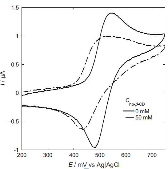 在這里,我們選擇 I2/I? 作為電化學(xué)探針,因?yàn)?I? 的電荷有望使其與陽(yáng)離子膠束的結(jié)合變得容易,并且電中性 I2 有望在膠束中表面活性劑的疏水部分之間增溶并溶解在電極表面的表面活性劑單層中。 我們研究了 hp-β-CD 對(duì) I2/I- 氧化還原峰的影響(圖 5)。 在沒有 hp-β-CD 的情況下,觀察到 I- 在約 530 mV 處的陽(yáng)極峰和 I2 在約 480 mV 處的陰極峰。 在 50 mM hp-β-CD 存在下,陽(yáng)極和陰極峰值電流均降低,并且它們的峰值電位向負(fù)方向移動(dòng)。 陽(yáng)極峰值電流的降低是由 I? 與 hp-β-CD 的親水表面結(jié)合引起的。 另一方面,陰極峰值電流的降低是由 hp-β-CD 疏水腔中包含 I2 引起的 [18]。 峰值電位的負(fù)移表明結(jié)合在 hp-β-CD 腔中的 I2 比結(jié)合到 hp-β-CD 表面的 I- 更穩(wěn)定。