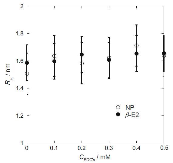 我們?cè)诿總€(gè) EDC 存在下通過動(dòng)態(tài)光散射方法研究了 HTA+ 膠束的 RH(圖 4)[17]。 隨著 EDCs 濃度的增加,膠束的流體動(dòng)力學(xué)半徑似乎逐漸增加。
