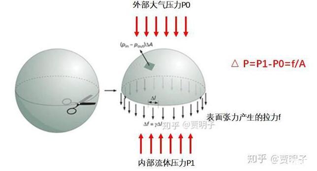 而這里有一件非常關鍵的事請,就是由于表面張力的存在,彎曲的表面就會在兩側(cè)形成壓力差。就好像緊繃的氣球,其內(nèi)部壓力要高于外部的壓力。這種壓力差來自哪里?當然就是氣球皮膜緊繃的張力。由于氣球的彎曲表面,使得其張力最終表現(xiàn)為內(nèi)部壓力的升高。