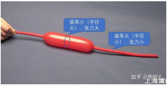 氣球內(nèi)部的氣體壓力處處相等,但是,接觸過這種氣球的人都有一個經(jīng)驗,就是粗的地方繃得緊,而細的地方繃得就不那么緊。如上圖所示,繃得緊的地方和繃得松的地方,產(chǎn)生的壓力差是相等的,但是他們的曲率是不相等的:曲率越大,同樣的張力所能產(chǎn)生的壓力差就更大。