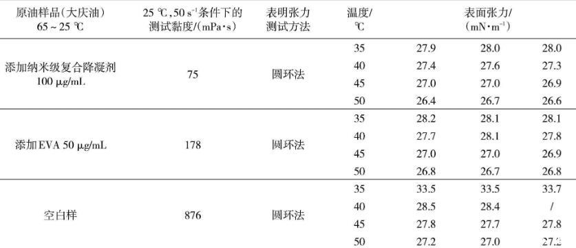 從表1可以看出,處理后添加納米級(jí)復(fù)合降凝劑100μg/mL大慶油樣、添加傳統(tǒng)EVA降凝劑50μg/mL大慶油樣、大慶空白油樣在25℃、50 s-1測試條件下的黏度是依次升高的,添加納米級(jí)復(fù)合降凝劑100μg/mL的大慶油樣品黏度最低,為75 mPa·s。相同的測試溫度條件下,黏度越大的油樣表面張力越大。其中,空白油表面張力最大,添加傳統(tǒng)EVA降凝劑的油樣次之,添加納米級(jí)復(fù)合降凝劑的油樣最小。原油油品的表面張力隨著溫度的降低而增大。