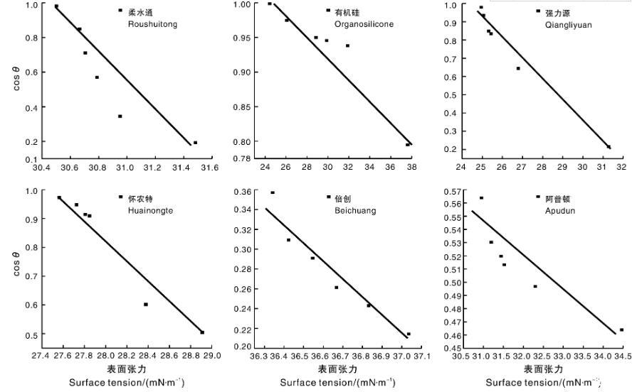 圖3苦參堿表面張力與接觸角的關(guān)系