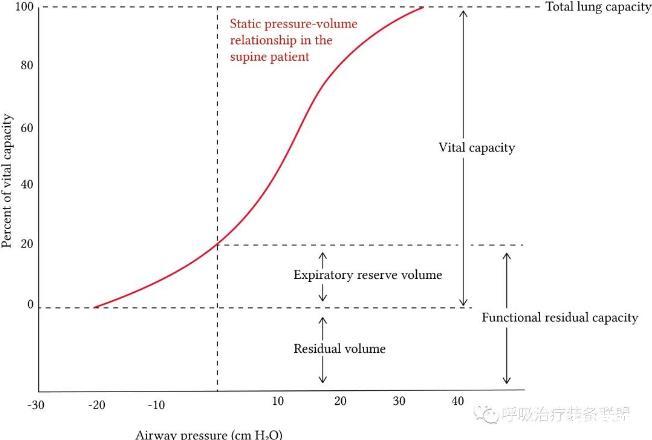 它展示了經(jīng)典的肺順應(yīng)性曲線,在低和高容量時(shí)順應(yīng)性較差,但在FRC之上,即在正常潮氣量的范圍內(nèi)是最佳的。