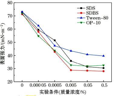 (1)表面張力的研究結(jié)果表明,溶液的表面張力均隨著表面活性劑質(zhì)量分?jǐn)?shù)的增大呈現(xiàn)降低的趨勢(shì);當(dāng)表面活性劑質(zhì)量分?jǐn)?shù)達(dá)到CMC后,溶液的表面張力不會(huì)再因?yàn)闈舛榷黠@下降;所選試劑中非離子表面活性劑SDBS在減小表面張力的效率和效能方面最優(yōu)。