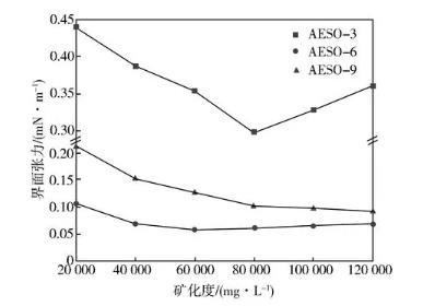 從圖2可以看出,隨著礦化度的增加,AESO-3的界面張力先降低后升高,AESO-6和AESO-9界面張力降低到平衡值后基本保持穩(wěn)定,在礦化度達(dá)到120 000 mg/L時(shí)界面張力仍能達(dá)到10-2mN/m數(shù)量級(jí),這說明EO聚合度的增加提高了脂肪醇聚醚磺酸鹽的耐鹽性能。這一現(xiàn)象可以用無機(jī)鹽對(duì)表面活性劑在溶液中的聚集形態(tài)的影響來解釋[15]。通常表面活性劑中的雙親基團(tuán)各自趨向于自身親和力強(qiáng)的溶液中,在油水界面規(guī)則排列形成一層親水基向外、憎水基向內(nèi)的薄層,溶液中濃度達(dá)到一定時(shí),表面活性劑分子發(fā)生聚集形成膠束。加入適量無機(jī)鹽,無機(jī)鹽正離子受靜電作用會(huì)在親水基附近聚集能夠降低親水基之間的靜電排斥、改變表面活性劑在界面的堆積形態(tài),從而降低油水界面張力;隨著無機(jī)鹽濃度繼續(xù)增大,無機(jī)鹽離子對(duì)表層進(jìn)一步壓實(shí),油相無法進(jìn)入膠束中導(dǎo)致界面張力增大。而對(duì)于非離子-陰離子表面活性劑,中性親水基團(tuán)EO的引入減弱了無機(jī)鹽對(duì)界面親水基的靜電作用,從而使其在礦化度較高的時(shí)候仍然能夠保持良好的界面活性。