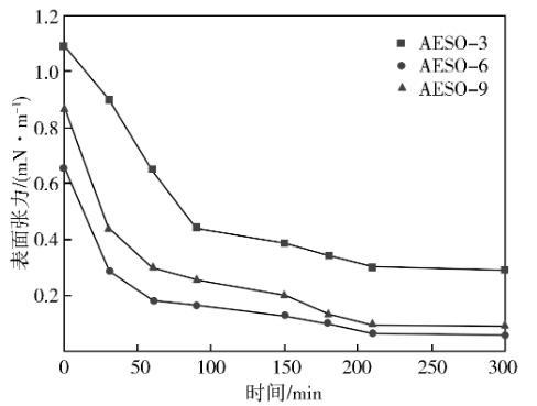 由圖1可以看出,隨著測(cè)試時(shí)間的推移,脂肪醇聚醚磺酸鹽與煤油之的界面張力逐漸減小并趨于穩(wěn)定。3種表面活性劑界面張力隨聚合的增大先減小后增大,其中AESO-3界面張力值最大,AESO-6界面張力值最小為6.03×10-2mN/m。