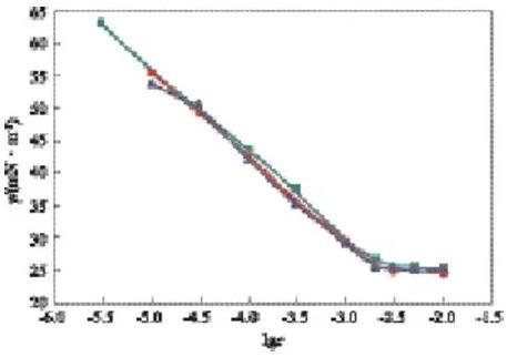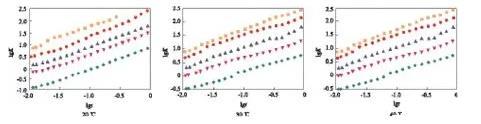 在lgc=-3.00時,可看出較完整的動態(tài)表面張力降低曲線,開始時表面張力接近溶劑的表面張力,隨時間的延長表面張力先快速下降,降至一定數(shù)值后,降幅趨緩,在一段時間內基本保持不變。因為氣/液界面新生成時,GSS362尚未在表面吸附,界面張力為溶劑的表面張力,隨著時間的延長,表面活性劑分子開始在表面吸附,氣/液界面張力降低,隨著吸附的進行,表面逐步趨于飽和,表面活性劑分子在表面吸附的速率下降,因而動態(tài)表面張力下降速率變慢,趨于平衡。