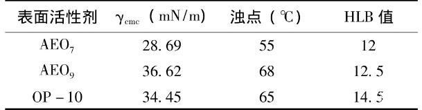 表面活性劑:脂肪醇聚氧乙烯醚AEO7(碳原子12,乙氧基數(shù)即EO數(shù)7),海安石油化工廠產(chǎn)品;脂肪醇聚氧乙烯醚AEO9(碳原子12,乙氧基數(shù)即EO數(shù)9)海安石油化工廠產(chǎn)品;辛基酚聚氧乙烯醚(OP-10,碳原子8,EO數(shù)10),廣州樂(lè)恒化工有限公司產(chǎn)品;去離子水。