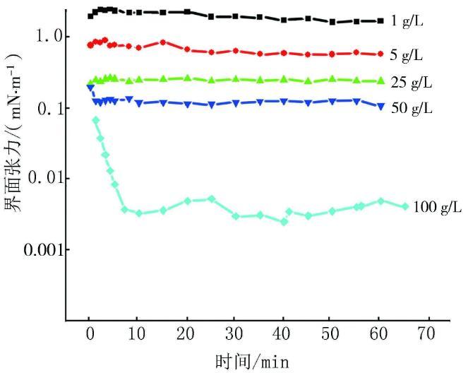 為了選擇合適界面張力體系來進(jìn)行驅(qū)油實(shí)驗(yàn),實(shí)驗(yàn)室內(nèi)配置了礦化度分別為1,5,25,50,100 g/L,質(zhì)量分?jǐn)?shù)為0.2%的9AS-3-0溶液,并對(duì)其與原油之間的界面張力進(jìn)行了測量。實(shí)驗(yàn)結(jié)果見圖1。