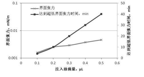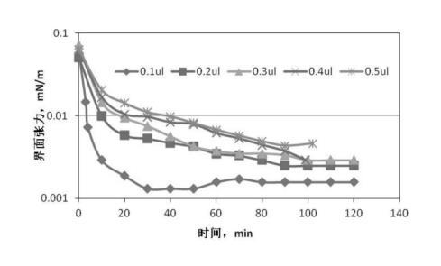 圖3、圖4是根據(jù)前述實(shí)驗(yàn)步驟1、2提供的配置與測量方法,油滴注入量分別為0.1μL、0.2μL、0.3μL、0.4μL、0.5μL,無堿二元驅(qū)配方體系與高凝油間界面張力的關(guān)系曲線。從圖2可知:無堿二元驅(qū)配方體系與高凝油間的界面張力達(dá)到超低界面張力的時(shí)間隨著油滴注入量的增多明顯延長,注入油滴0.1μL,4分鐘達(dá)到超低界面張力,注入油滴0.5μL,40分鐘達(dá)到超低界面張力;從圖4可知:注入油滴量大于0.3μL以后,對(duì)無堿二元驅(qū)配方體系與高凝油間界面張力的測定不能持續(xù)2小時(shí),油滴在100分鐘發(fā)生斷開,對(duì)于高凝油而言,油滴注入量小于0.3μL較適合。