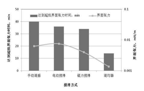mN/m;手動(dòng)混搖的方式達(dá)到超低界面張力的時(shí)間最長,為40分鐘,電動(dòng)攪拌和磁力攪拌差別不大?;靹蚱鲾嚢璺绞绞谷芤耗茉诙虝r(shí)間內(nèi)達(dá)到均相且均相程度高,均相程度越高,達(dá)到超低界面張力的時(shí)間越短。